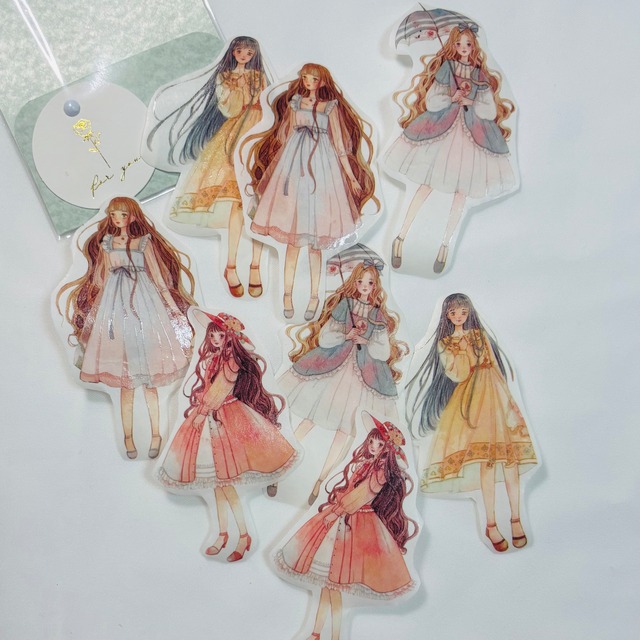 シックな少女シール〈クリア・切り離しタイプ〉 シックなイラストの女の子をデザインした、クリアタイプのシールセットです。 透明感のあるPET素材で、手帳やノート、ラッピングなどに貼るだけでぐっとおしゃれな雰囲気に。全12枚入りで、1枚のサイズは約6.8×3.5cmと使いやすい大きさです。 日々の手帳デコやスクラップブック、ギフトのちょっとしたアクセントにもぴったり。 お気に入りのアイテムに貼って楽しめます。 セット内容 ・サイズ:約6.8×3.5cm ・12枚入り ・素材:PETテープ(中国製) ご使用上の注意 ・水濡れする場所での使用はお控えください ・高温多湿での保管は避けてください 発送について ・ご注文から3〜5営業日以内に発送いたします ・ご変更やキャンセルはできるだけお早めにご連絡ください ※できるだけ実物に近い色で撮影していますが、モニター環境により多少色味が異なる場合があります。 ※貼る前に配置を試していただくと、より安心してお使いいただけます。 お気に入りの時間をちょっとおしゃれに彩ってくれるシールです。ぜひお楽しみください。
