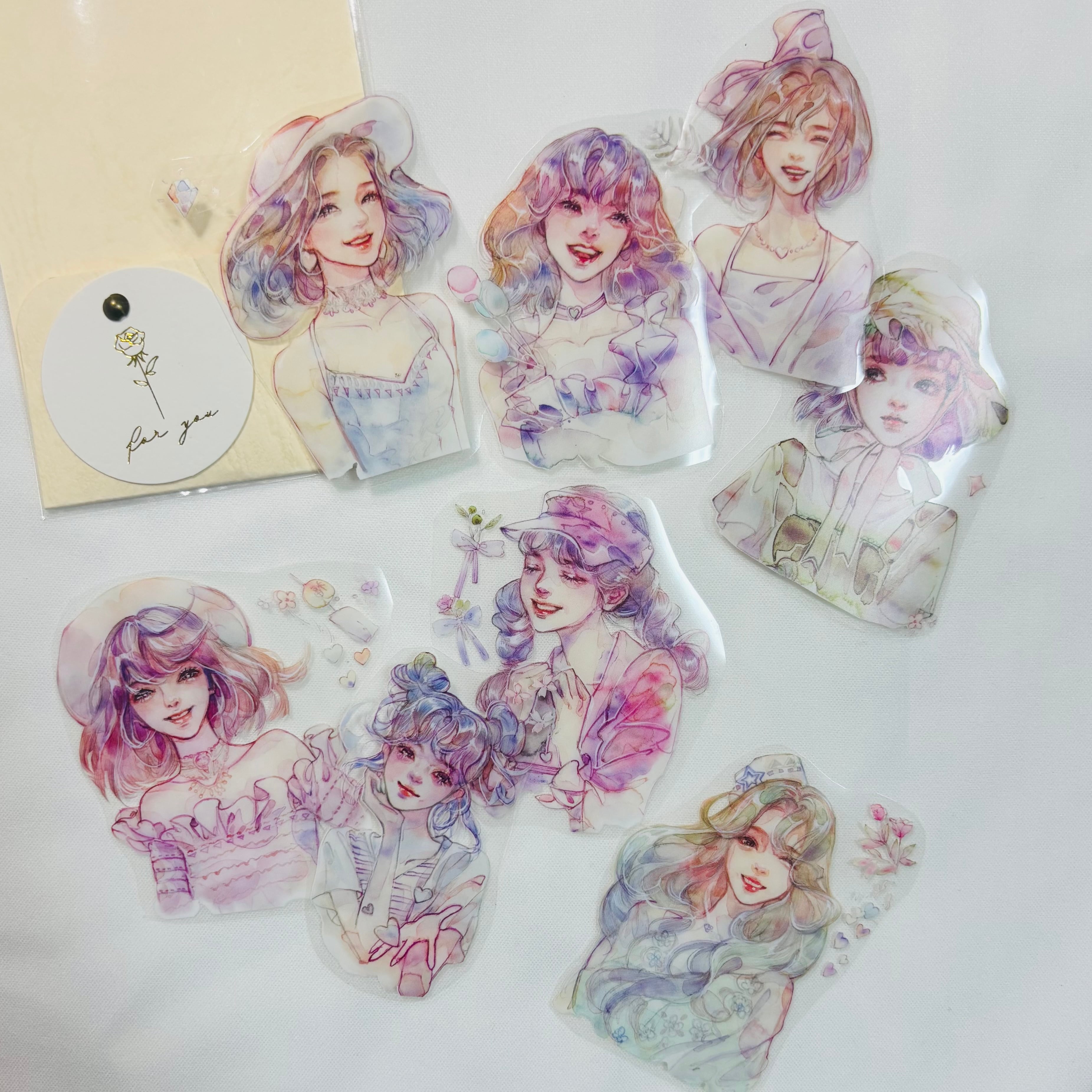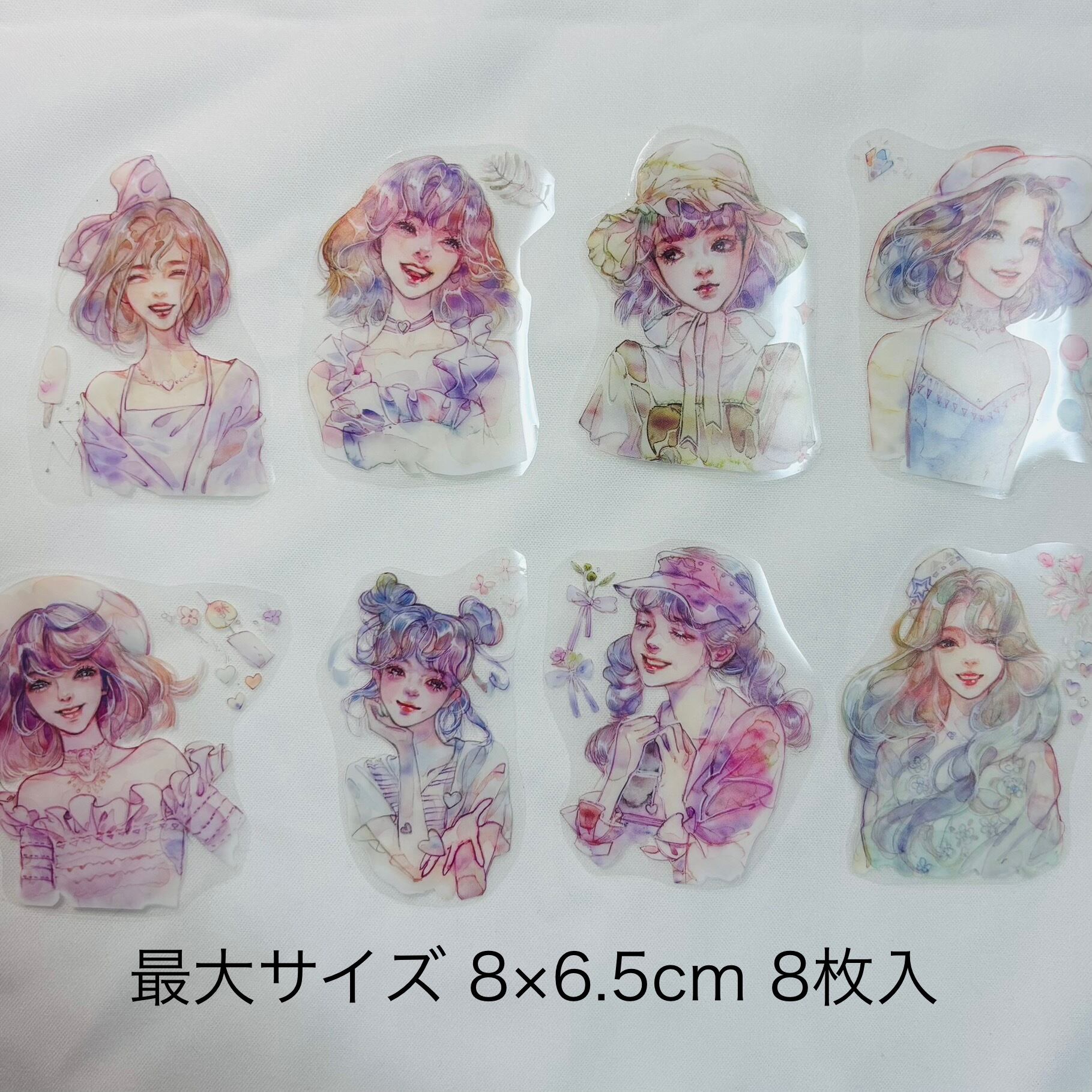 透明感のあるPET素材で、手帳やノート、ラッピングなどに貼るだけでぐっとおしゃれな雰囲気に。全8枚入りで、1枚のサイズは約8×6.5cmと使いやすい大きさです。